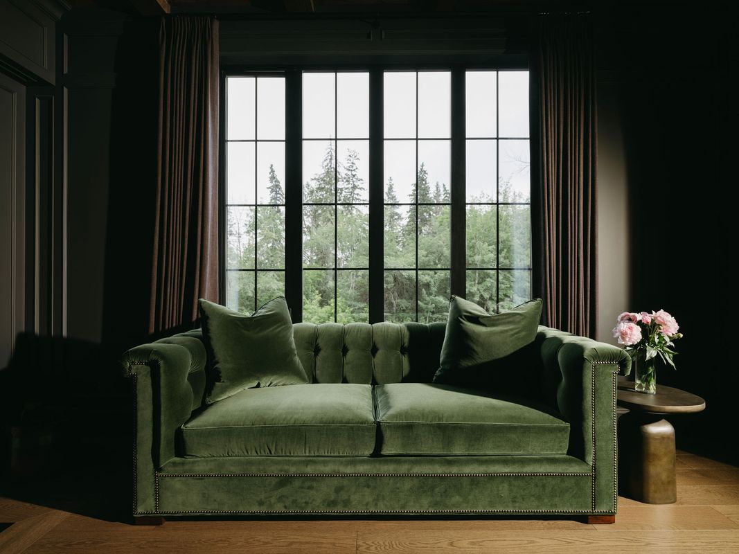 Elsewhere, the mood deepens: a Kent Tufted Sofa in plush green velvet transforms the lounge into a moody retreat—part reading nook, part speakeasy. A classic Bernhardt wing chair in brown leather plays counterpoint, its heritage shape grounding the jewel-toned space. In the primary bedroom, a custom Alex Bed by Cottswood Collection softens aubergine-hued panel walls, marrying tradition with modern textile warmth.