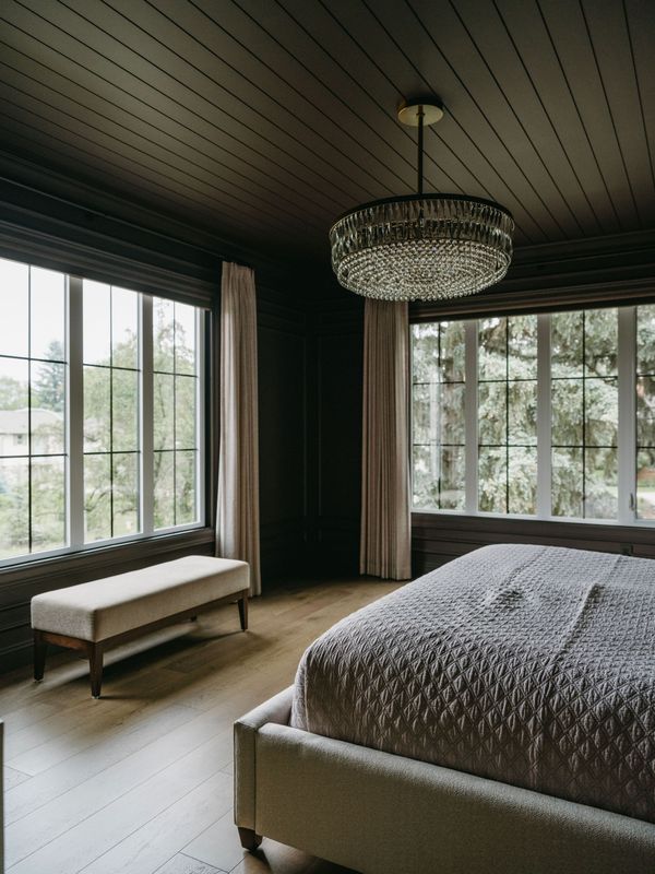 The design philosophy at the heart of this project was a thoughtful fusion of past and present. Guided by principal designer Deanna Charron of Deanna Charron Designs, the interiors honour familiar silhouettes—camel-back sofas, tufted seating, tailored panel beds—reinterpreted through modern materials, finishes, and fabrics. The result is a home that feels curated, cohesive, and deeply personal.