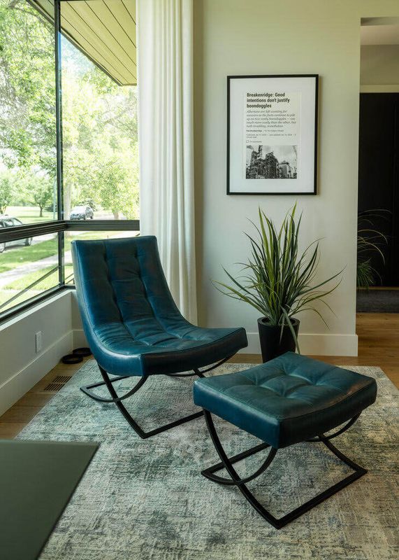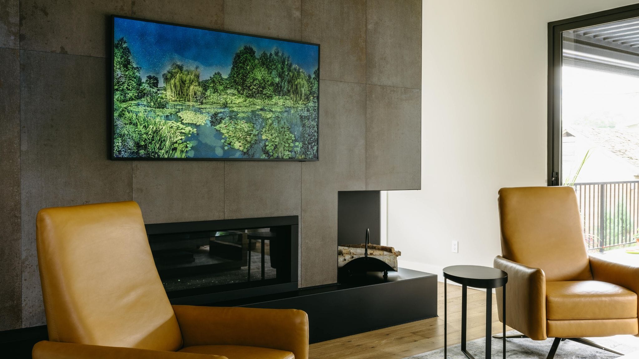 We were working off-plan, and I knew the fireplace wall was concrete! I wanted to contrast it with the gorgeous butterscotch Italian leather, which paired beautifully with the charcoal concrete. While the concrete wall is a strong architectural feature, I aimed to make the space feel inviting and enjoyable. Additionally, since the house is on a park, the greens from the leaves and blues from the sky became important natural elements to incorporate into the design. It's challenging to ignore these elements, so you need to embrace them.
