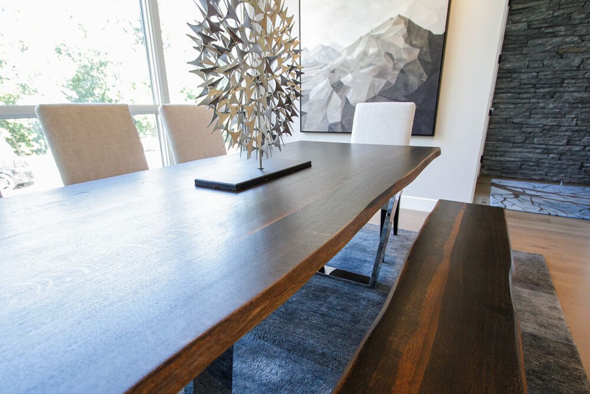 In the dining room, Allison played off the elements that were already there, bridging the gap between the angular shapes within the structure and the organic beauty of the ravine outside. This juxtaposition is most evident in the table—its seared oak live-edge top paired with its polished stainless steel base marry the two worlds together in a single piece of furniture. Substantial yet simple, the piece connects the rest of the room together without feeling heavy. The room’s new sense of spaciousness has come as a relief to Jeff, who felt something wasn’t quite right with the bulkier pieces that had been there previously, but it took Allison’s expert eye to find the right solution.